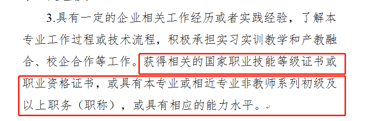 《基本標(biāo)準(zhǔn)》中要求,無論是中等職業(yè)學(xué)校教師、高等職業(yè)學(xué)校教師,還是技工院校“一體化”教師,在申報(bào)各層級(jí)“雙師型”教師時(shí),都要求教師獲得相關(guān)的國(guó)家職業(yè)技能等級(jí)證書或職業(yè)資格證書,或具有本專業(yè)或相近專業(yè)非教師系列初級(jí)及以上職務(wù)(職稱),或具有相應(yīng)的能力水平。